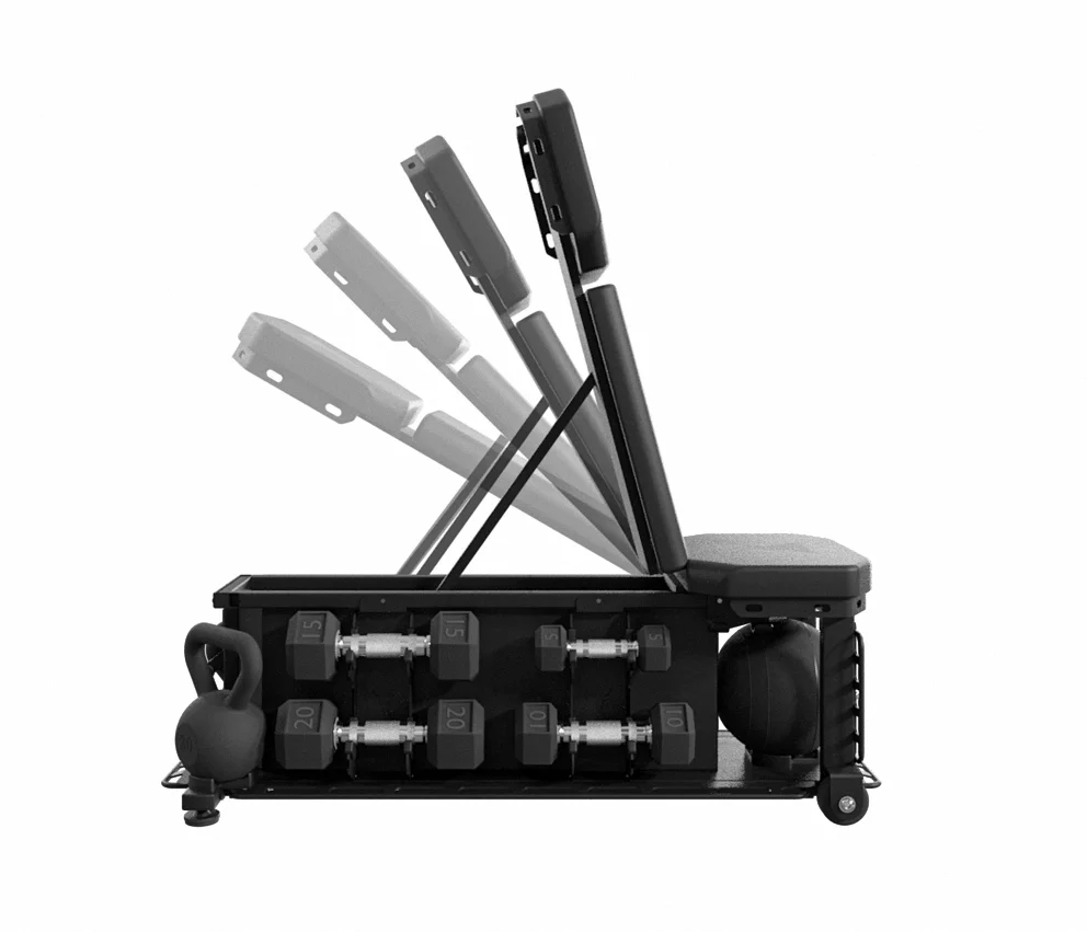 • El banco articulado dual ofrece una sencilla transición de horizontal a inclinado o sentado, y cada posición en el medio y ofrece suficiente espacio de almacenamiento para accesorios de fitness.