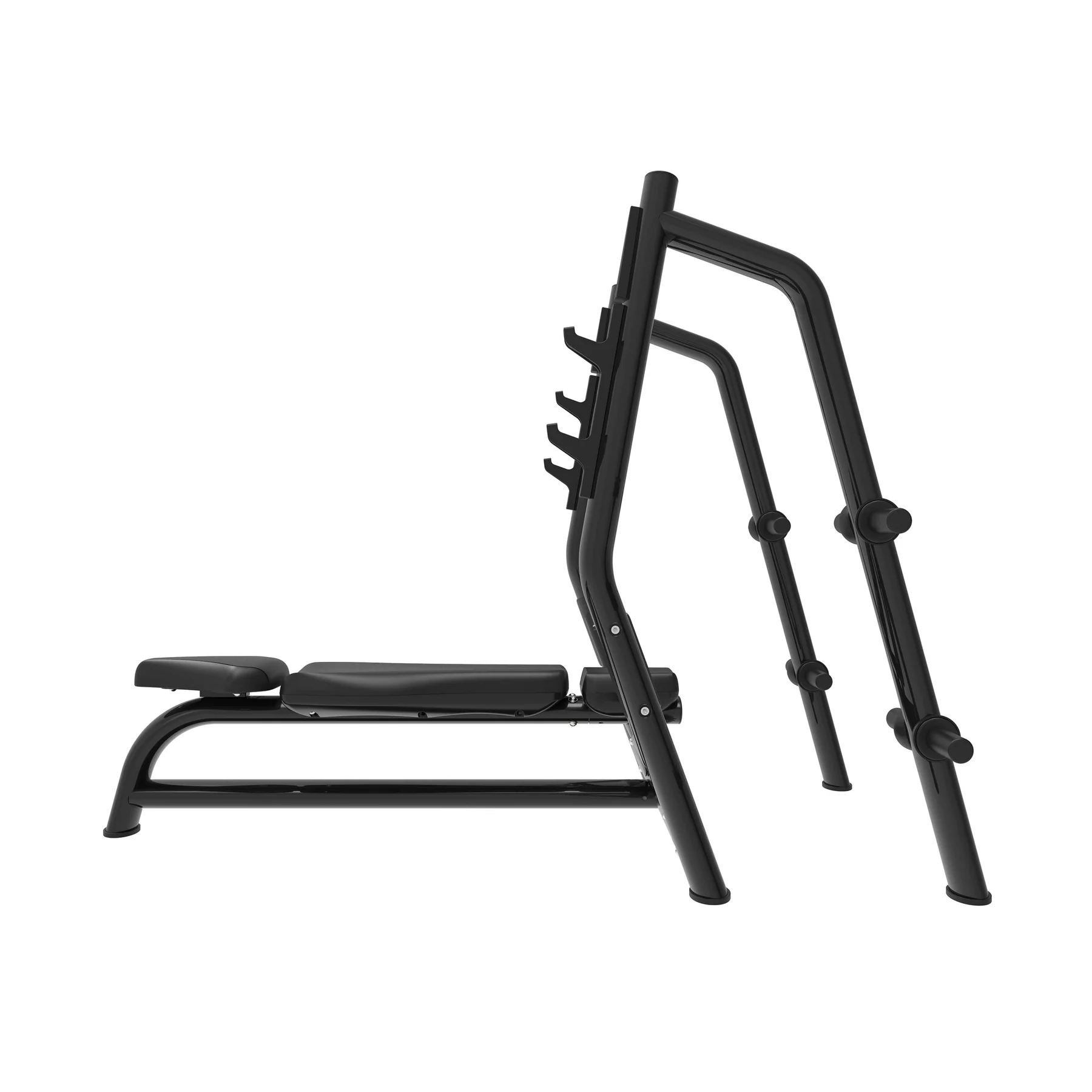 - Sistema de almacenaje integrado: cuatro salidas laterales para guardar discos olímpicos y mantener el área de trabajo ordenada.