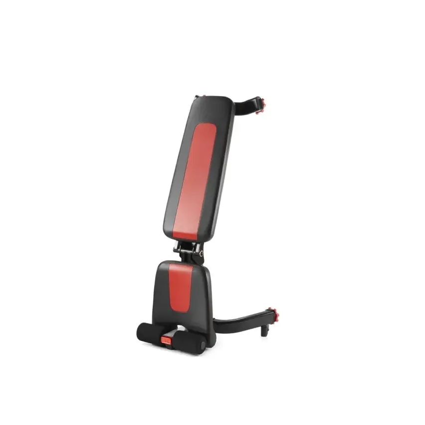 - Diseñado para ahorrar espacio. Entre entrenamientos puedes guardar el banco con un sencillo proceso de click-lift-and-go (bajar respaldo, y colocarlo en posición vertical con ayuda del asa y las ruedas).