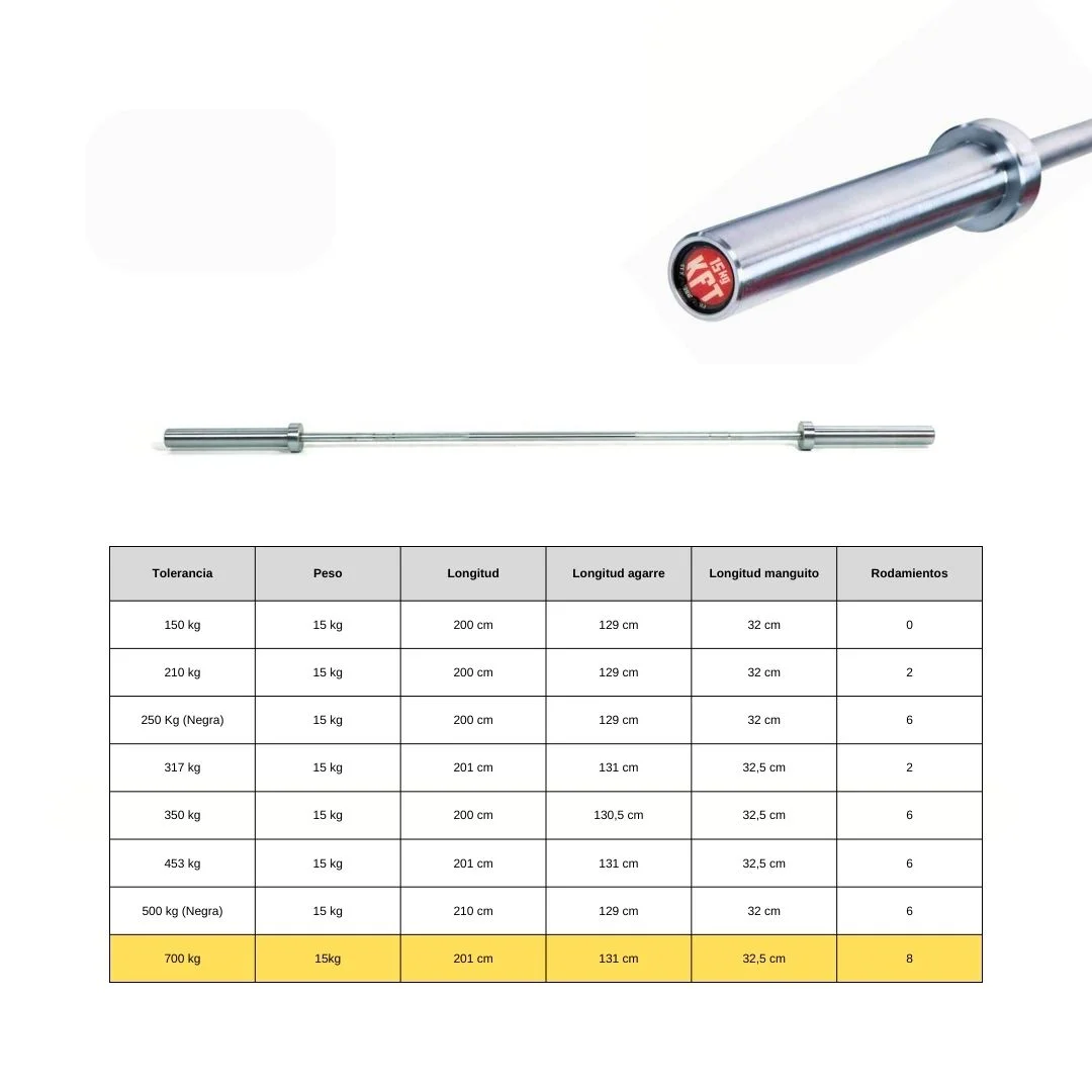 - Barra olímpica fabricada con el material más resistente del mercado.