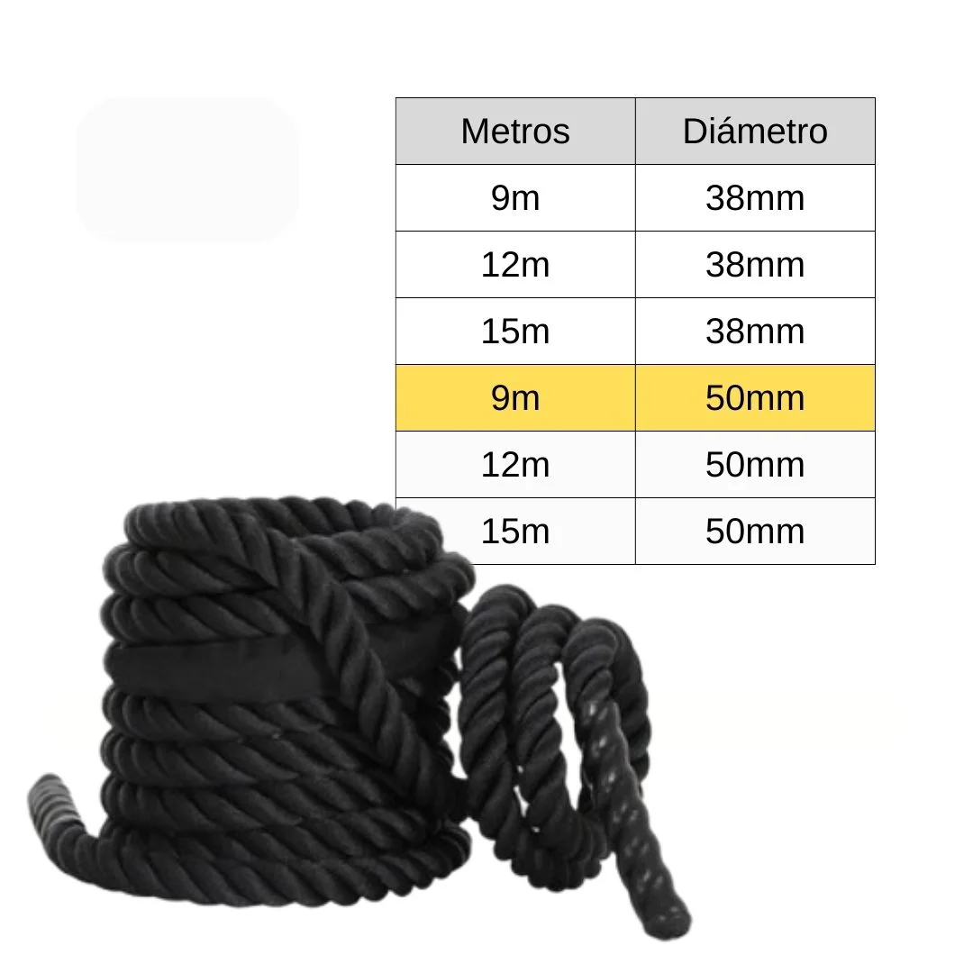 - Battle rope de 9m de longitud y 50mm de diámetro.