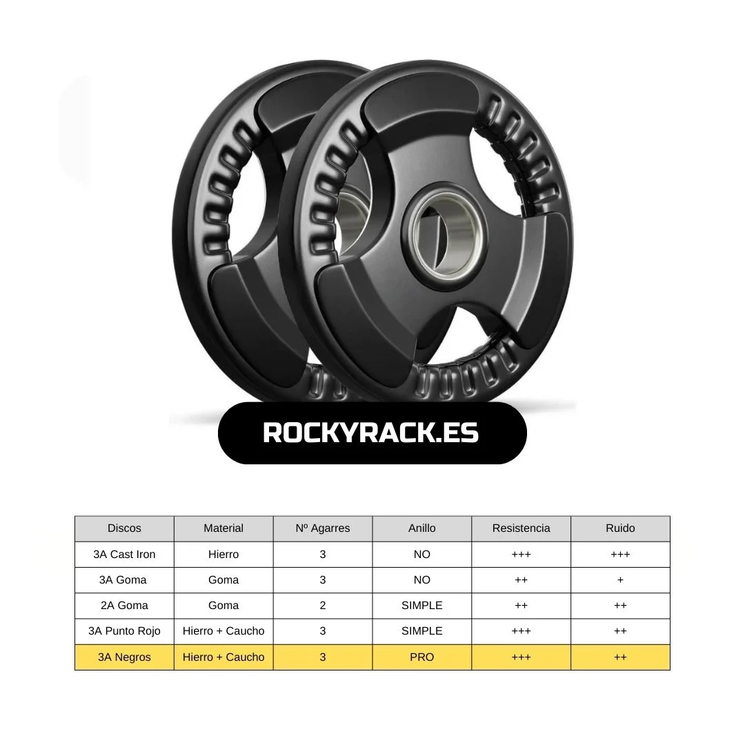 ![Discos 3 AGARRES Caucho - Con Anillo [de 1,25 a 25kg]](https://rockyrack.es/wp-content/uploads/2023/12/comprar-discos-olimpicos-con-3-agarres-negros.webp)