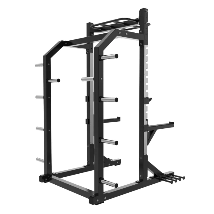 Half rack multifuncional con almacenamiento de discos, varillas para elásticos y spotter arms.