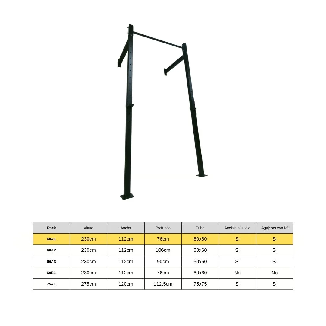 - 60A2 – las barras conectoras a la pared son de tubo redondo (Barra de pull up) y miden 100cm