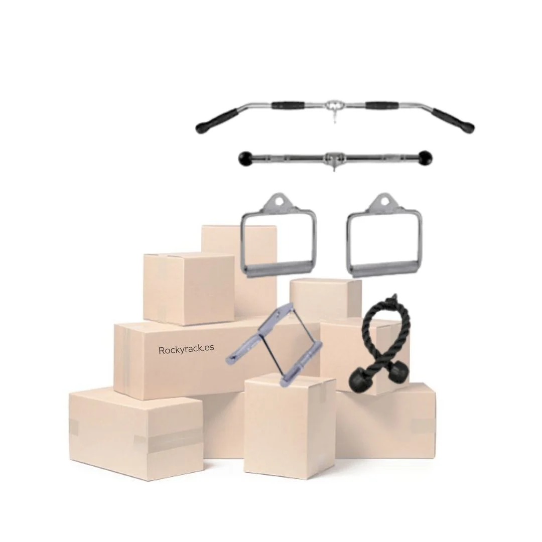 - Set compuesto de barra larga de Jalón (dorsal), barra corta recta para bíceps y tríceps, 2 agarres de polea básicos, un agarre de remo Gironda o triángulo, y unas cuerdas de tríceps.