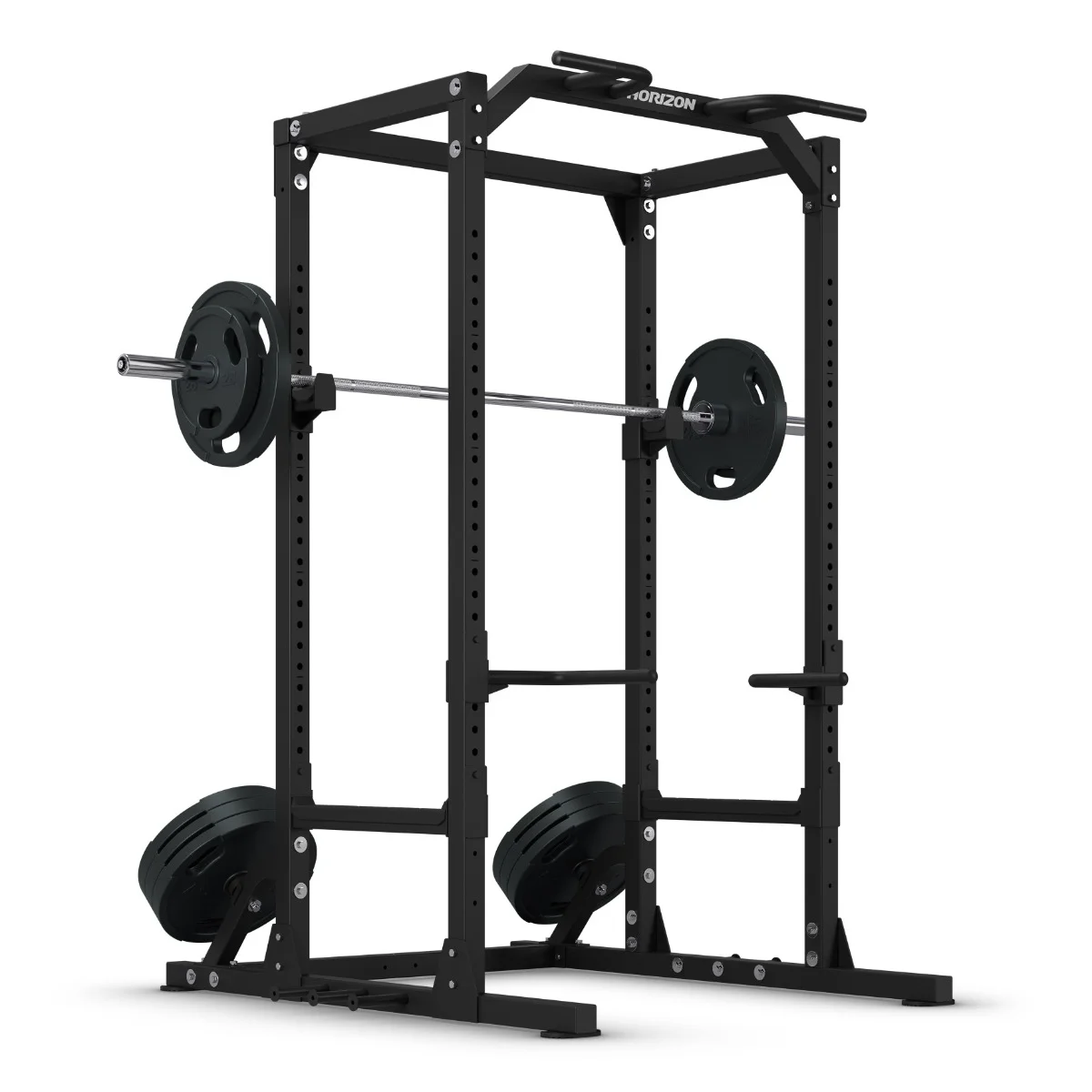 - El rack incluye soportes integrados para discos y barras olímpicas, manteniendo el espacio de entrenamiento organizado y seguro.