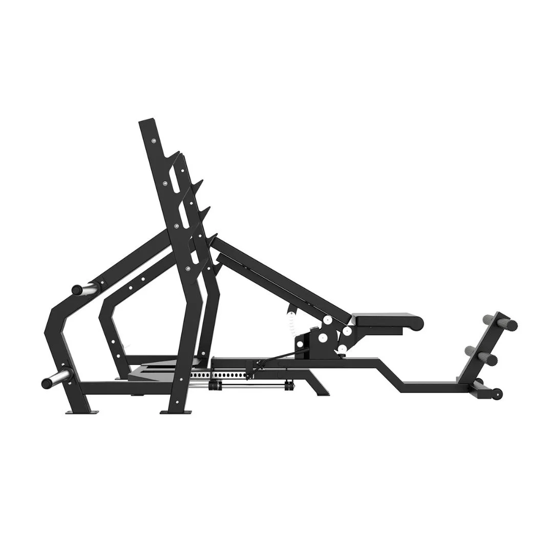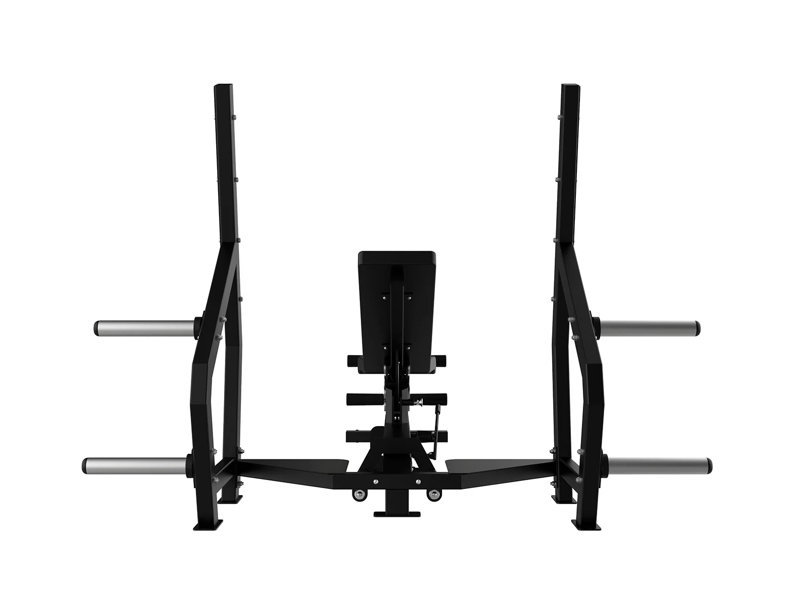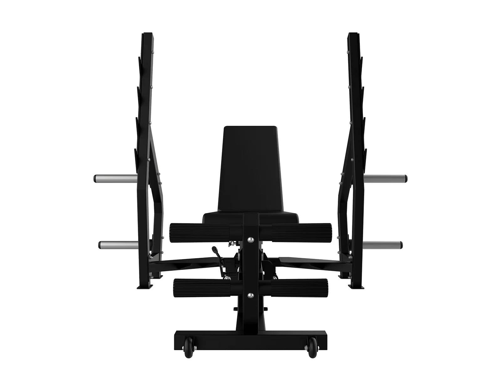 - Soportes y agarres de seguridad: Incluye barras laterales para discos y soportes de barra con varias alturas de seguridad.