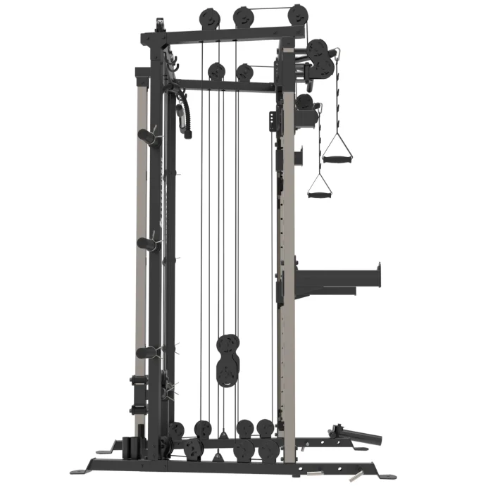 - Esta versátil máquina te permite realizar ejercicios como sentadillas, dominadas, curls de bíceps, extensiones de tríceps y peso muerto.