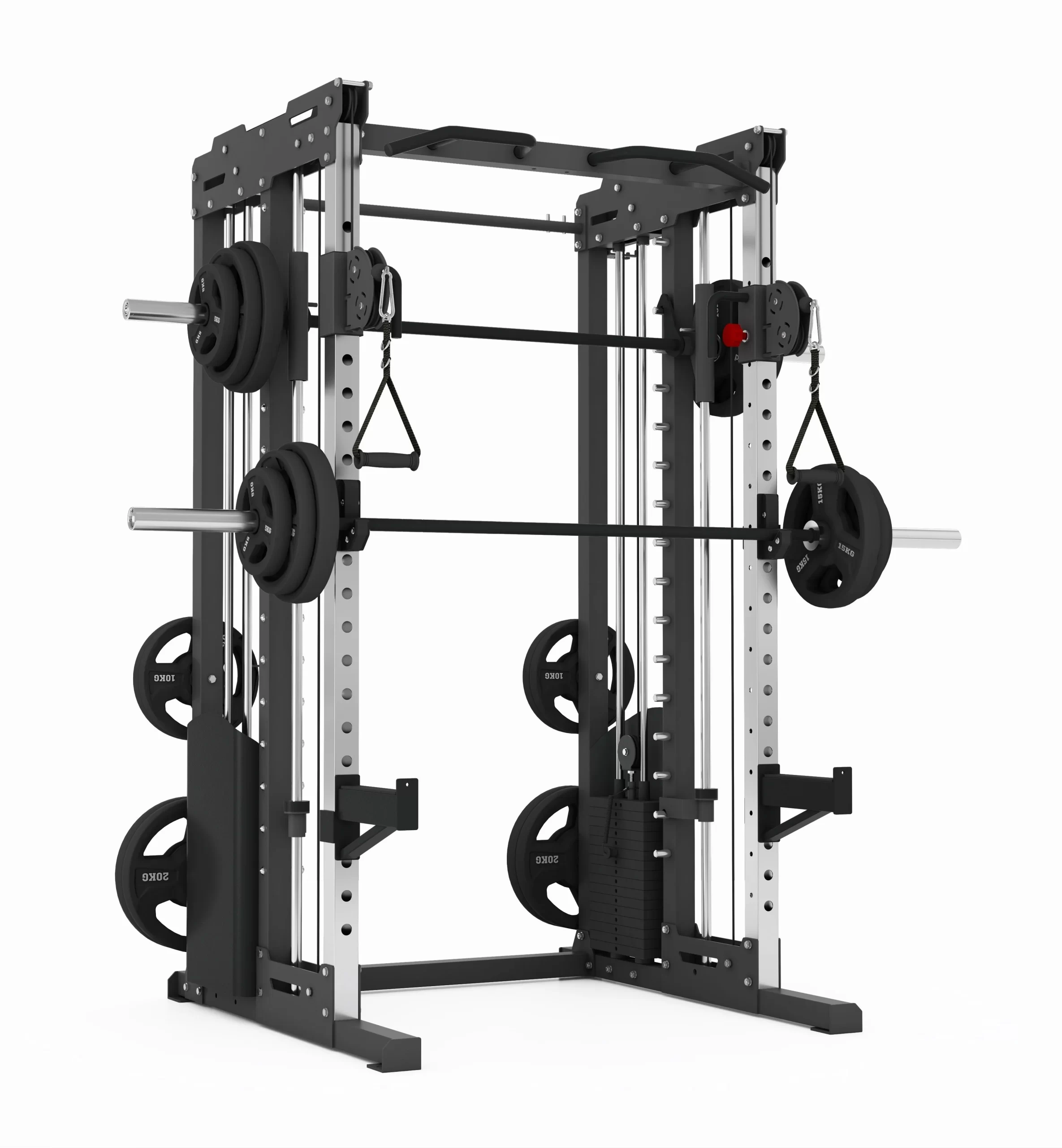 - Su amplio número de soportes para barra larga garantiza una estabilidad óptima durante tus rutinas de entrenamiento. Esta máquina Multipower con Doble Polea de Titanium Strength es una máquina funcional de 8 puntos de tracción con sistema smith/adhesión a la barra olímpica con 2 pilas de placas de 72 kg (se necesitarán discos olímpicos para la barra Smith). La barra Smith se engancha a las 2 poleas anchas ajustables y gira como un sistema tradicional de una Smith con safety spotters ajustables en altura.